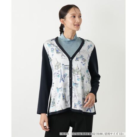 エッフェル塔などプリント柄が目を引く、洗練されたカーディガンです。ノーカラーのVネックデザインは、顔周りをすっきりと見せ、インナーとのレイヤードも楽しめます。長袖ですので、秋の羽織りとして、また季節の変わり目の気温調整にも活躍する便利な一枚です。一枚でコーディネートの主役になる存在感がありながらも、様々なアイテムと調和します。軽やかな素材感で、快適な着心地を実感いただけます。