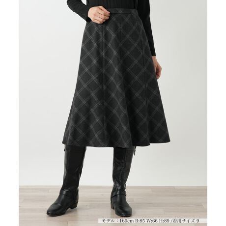 トラッドなチェック柄を、バイアス使いで表情豊かに仕上げたフレアスカート。斜めに流れるパターンが縦のラインを演出し、動くたびに優雅に揺れるシルエットが魅力です。ウエストはゴム仕様で心地よくフィットし、トップスをインしてもすっきりと決まり、穿き心地も良いアイテム。シンプルなニットやブラウスを合わせるだけで、秋らしく知的なコーディネートが完成する主役級のアイテムです。