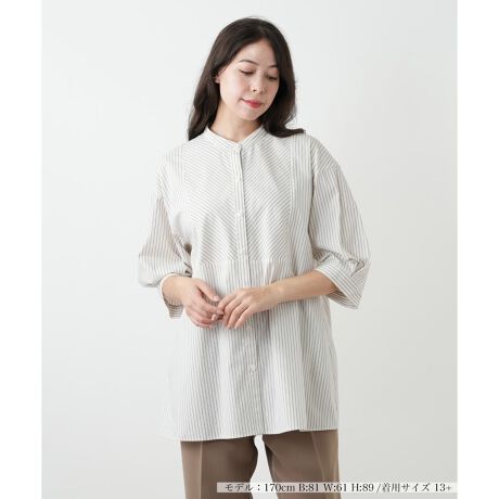 胸元のボザム切り替えに、さりげないこだわりが光るストライプ柄のバンドカラーブラウス。ボザム部分の生地をバイアス使いにすることで、ストライプ柄に動きを出し、表情にさりげなく変化を生み出しています。高めの位置で切り替えたウエストからふんわりと広がるシルエットが、ウエスト回りをナチュラルにカバー。伸縮性のあるコットンナイロン素材で着心地も良く、一枚で着映えする秋の主役級トップスです。