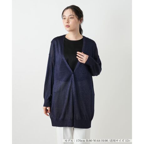 繊細なラメの輝きが、いつものスタイルを上品に格上げしてくれるロングカーディガン。縦のラインを強調するシルエットと丈感が、気になる腰回りやヒップをさりげなくカバーし、全身をすっきりと見せてくれます。フロントは1つボタン留めで着こなしに程よいアクセントをプラス。伸縮性のあるやや薄手のニットは、軽やかでストレスフリーな着心地を実感できます。さらに繊細な透け感が、重くなりがちな秋の装いに抜け感を演出。