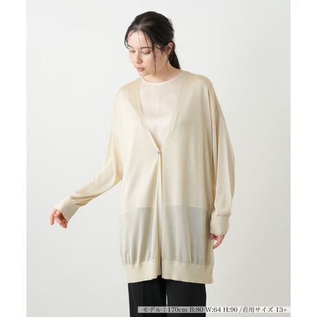 繊細なラメの輝きが、いつものスタイルを上品に格上げしてくれるロングカーディガン。縦のラインを強調するシルエットと丈感が、気になる腰回りやヒップをさりげなくカバーし、全身をすっきりと見せてくれます。フロントは1つボタン留めで着こなしに程よいアクセントをプラス。伸縮性のあるやや薄手のニットは、軽やかでストレスフリーな着心地を実感できます。さらに繊細な透け感が、重くなりがちな秋の装いに抜け感を演出。