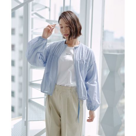 シアー素材を使用した軽やかな初秋向けジップジャケット。程よい透け感と薄手素材で、羽織りやすい一着です。裾と袖口にゴムが入っているため、ふんわりとしたシルエットが女性らしい柔らかさをプラス。前身頃はジップアップ仕様で着脱も簡単で、スタイリングにアクセントを与えます。袖の透け感が抜け感を演出し、季節の変わり目のコーディネートに最適。ポケット付きで実用性も備え、カジュアルにもきれいめにもマッチするジャケットです。軽やかな素材感で持ち運びもしやすく、デイリーからお出かけまで幅広く活躍します。
