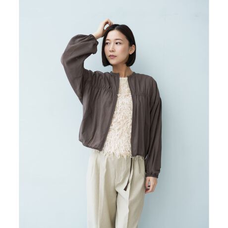 シアー素材を使用した軽やかな初秋向けジップジャケット。程よい透け感と薄手素材で、羽織りやすい一着です。裾と袖口にゴムが入っているため、ふんわりとしたシルエットが女性らしい柔らかさをプラス。前身頃はジップアップ仕様で着脱も簡単で、スタイリングにアクセントを与えます。袖の透け感が抜け感を演出し、季節の変わり目のコーディネートに最適。ポケット付きで実用性も備え、カジュアルにもきれいめにもマッチするジャケットです。軽やかな素材感で持ち運びもしやすく、デイリーからお出かけまで幅広く活躍します。