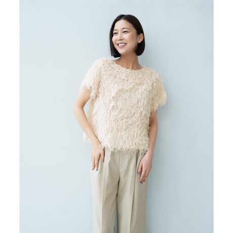 羽のような毛足の長いシャギー素材が、ラグジュアリーなムードを醸し出す、プルオーバータイプのブラウス。フロントはシンプルなクルーネックですが、リボンがアクセントになったバックVネックが絶妙な抜け感をプラス。見た目以上に軽く、透け感のある素材なので、インナーとのレイヤードで様々な表情を演出できます。シンプルな服装にプラスするだけで、一気に華やかさと季節感のある着こなしが完成します。