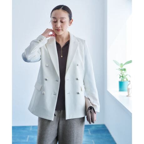 きちんと感と快適な着心地を両立した、ダブルブレストジャケット。シャープなピークドラペルと輝くアクセントボタンが、トラッドで洗練された印象を与えます。ジャケットらしい端正なルックスながら、伸縮性に優れた柔らかな素材を使用。裏地のない軽やかな仕立てで気軽に羽織れるのが魅力です。オフィススタイルにはもちろん、デニムと合わせてカジュアルダウンするのもおすすめ。オンオフ問わず着回せる、大人のワードローブに欠かせないアイテムです。