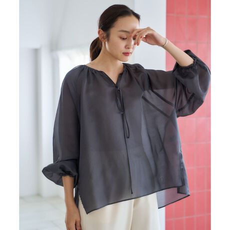 上品な光沢と、とろみのある風合いが魅力のボリュームスリーブブラウス。空気をはらむような軽やかな生地が美しいドレープを生み出します。袖口にゴムを入れることで、ふんわりと立体感のあるスリーブを実現しました。胸元のリボンがフェミニンなアクセントとなり、程よい透け感がコーディネートに抜け感をプラス。きれいめスカートからカジュアルなパンツまで、合わせるボトムを選ばない着回し力の高いトップスです。