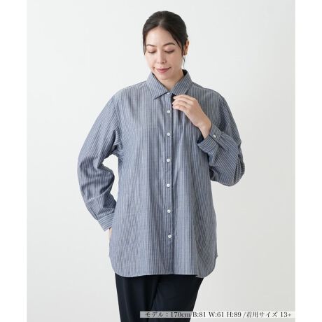 異なる二つのデザインが楽しめる、リバーシブル仕様のシャツブラウス。表側はクリーンで知的な印象のストライプ柄、裏側は秋らしいシックなタータンチェック柄です。その日の気分やコーディネートに合わせて、お好みで着こなしが楽しめます。ゆったりとしたシルエットと、後ろ身頃のギャザーが、リラックス感と女性らしい柔らかな雰囲気を演出。一枚で着るのはもちろん、軽い羽織りとしても活躍する、着回し力抜群のアイテムです。