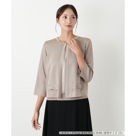 繊細なラメが煌めく大人可愛い、ショート丈のニットカーディガン。前ウエスト部分にあしらった小ぶりなリボンが、フェミニンなアクセントを効かせます。ネック中央にはジュエリーのように煌めくビジューボタンを飾り、顔周りを華やかに演出。伸縮性のある軽やかなやや薄手のニットで、季節の変わり目の羽織りにぴったりです。コーディネートを上品かつ甘いニュアンスに仕上げてくれるアイテムです。