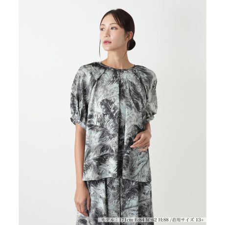 一枚の絵画を纏うように、ドラマティックなフェザー柄が華やかなブラウス。肩のラインを気にせず着られるラグランスリーブと、ふんわりとしたパフスリーブが女性らしい柔らかな雰囲気を演出します。同素材のスカートと合わせれば、ワンピース見えする格調高いセットアップスタイルが完成します。秋の装いをエレガントに彩る、主役級のトップスです。