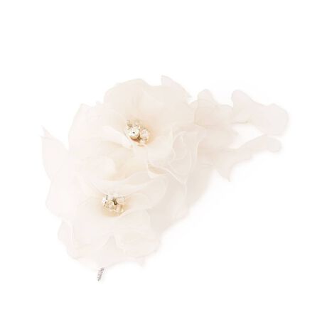繊細なシルクオーガンジーを贅沢に重ねて作られた、美しいコサージュ。ふんわりとした透明感と軽やかさを備え、光をまとうたびに表情を変え、優美な輝きを放ちます。幾重にも重ねられた花びらは、まるで本物の花が咲き誇るような立体感と息をのむほどの繊細さを表現しています。中央にはクリスタルがあしらわれ、上品な煌めきのアクセントを添えています。卒業式や入学式、結婚式といったフォーマルなシーンでのスーツやドレスの胸元を格上げします。