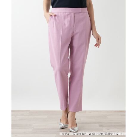 きちんと感と快適さを両立した美シルエットのパンツ。センタープレスが縦ラインを強調し、スタイルアップ見せ効果も期待できます。やや薄手の生地は伸縮性があり、動きやすさをサポート。ウエストは後ろのみゴム仕様で、すっきりとした見た目ながらフィット感も抜群です。お手持ちのアイテムとも合わせやすくオフィススタイルからお出かけまで、幅広く活躍するベーシックアイテムです。