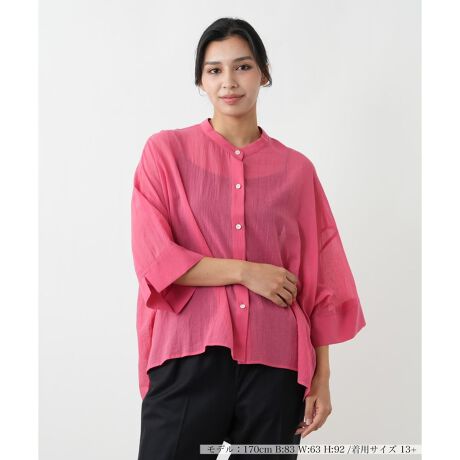 軽やかな質感のシアーな生地が、風をはらんでふわりと揺れる表情を演出します。全体に施された自然なシワ加工は、装いに奥行きとこなれた雰囲気を加えるとともに、肌離れの良いさらりとした肌触りを生み出します。ゆったりとした身頃とドロップショルダーが、身体のラインを拾わないリラックス感あふれる着心地を叶えます。すっきりと立ち上がったバンドカラーと、前後で丈の異なる裾デザイン、そして抜け感を添えるサイドのスリットが、洗練された印象をもたらします。前開きの仕様により、様々なスタイルに合わせた着こなしをお楽しみいただけます。