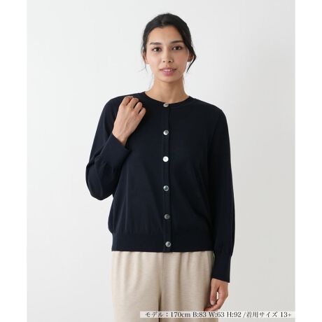 さらりとした肌触りが特長のコットンアセテート素材を使用したカーディガン。ノーカラーの丸首と長袖のデザインが、上品なスタイルを提案します。衿、袖口、裾にはアイレットクロス柄があしらわれ、大きめの釦がアクセントに。ご自宅で手洗い可能なウォッシャブル仕様で、日常使いにも便利です。