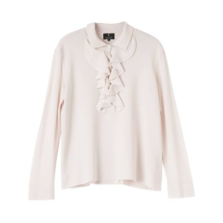 ブラウスのように華やかなフロントラッフルデザインが印象的な長袖ニットトップス。