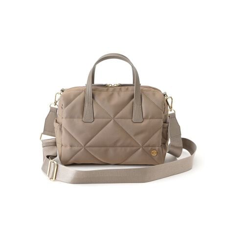 立体感のあるダイヤ柄キルティングが、トレンドライクな表情を見せる2WAYハンドバッグ。軽量なナイロンボディに、上品な牛革ハンドルを組み合わせ、カジュアルな中にきちんと感をプラス。取り外し可能な幅広のストラップ付きで、ショルダーやクロスボディとしても活躍。コンパクトながらマチが広く、見た目以上の収納力も魅力です。デイリーユースにぴったりのデザイン性と機能性を兼ね備えたアイテムです。