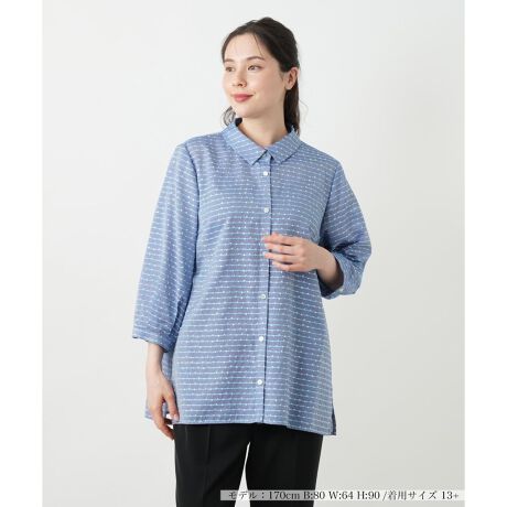 手の込んだ刺繍ボーダーがさりげなく表情を添え、着こなしに軽やかな奥行きを与えるブラウス。清涼感のあるやや薄手の生地を使用し、さらりとした肌触りで着心地も快適です。七分袖が手首まわりをすっきりと見せ、袖口のタックがさりげない立体感を演出。裾にはサイドスリットを施し、動きやすさとこなれ感を両立しています。シンプルなボトムと合わせるだけで、きちんと感とリラックス感のバランスが絶妙なスタイルが完成。