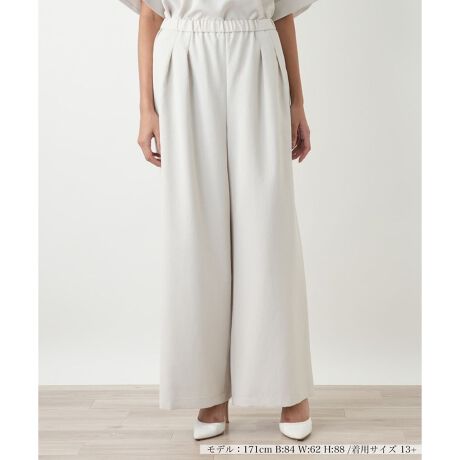 レッグラインをカバーしつつも、足元をすらりと長く見せるワイドシルエットのパンツ。ウエストは全面ゴム仕様で、リラックス感のある穿き心地ながら、トップスをインしても美しいウエストラインをキープ。両サイドには便利なポケットも配しています。同素材のトップスと合わせれば、旬のセットアップスタイルが完成。洗練されたワントーンコーデはオフィスシーンからカジュアルなお出かけまで、幅広いシーンで活躍してくれそうです。ご自宅で手洗い可能なのでお手入れも簡単。