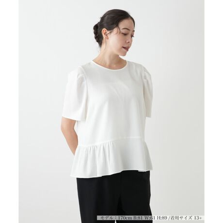 ふんわりと広がるペプラムシルエットが、女性らしさを引き立てるブラウス。気になるウエスト周りをさりげなくカバーしつつ、スタイルアップも期待できます。さらにショルダーのギャザーもフェミニンなエッセンスに。軽やかな素材感で上品な抜け感を演出します。きれいめのパンツと合わせてオフィススタイルに、デニムと合わせてカジュアルダウンするなど、オンオフ問わずフレキシブルに着回せるトップスです。