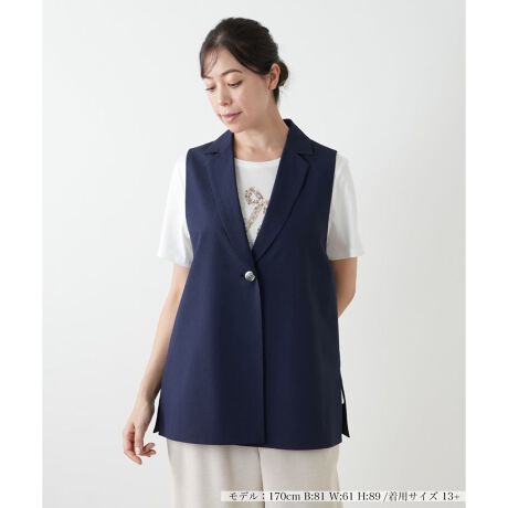 カットソーやブラウスの上にさっと羽織るだけで、大人の品格を添えてくれるラペルドベスト。きちんと感のあるノッチドラペルが顔周りをシャープに見せ、スタイリングを引き締めます。カットソーやニットの上に重ねるだけで、普段の着こなしがワンランクアップ。ワンピースに羽織ればオフィスにも対応できるきちんとスタイルに。薄手で軽やかな着心地なので、カーディガン感覚で気軽に羽織れます。初秋のレイヤードスタイルにぴったりのアイテムです。