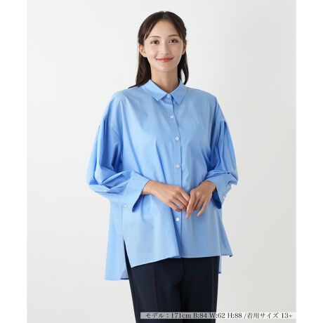 これからの季節らしいこなれたムードを演出する、リラックス感溢れるビッグブラウス。バックネック下にたっぷりと施したプリーツが、後ろ姿に美しいドレープと立体的なフォルムを生み出します。ドロップショルダーと身体をふんわりと包むルーズシルエットで、気になる体型も自然にカバー。深いサイドスリットが、着こなしに軽やかな抜け感をプラスします。細身のパンツと合わせて、前だけタックインするスタイルもおすすめです。