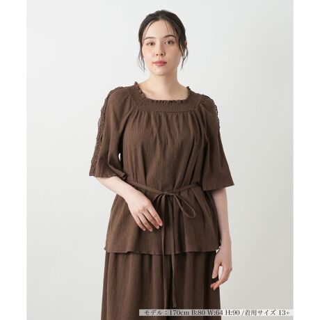 くしゅっとしたシワ感のあるナチュラルな生地に、繊細なディテールを詰め込んだフェミニンなフレアブラウス。襟ぐりに施されたシャーリングゴムが、ふんわりと柔らかなシルエットを演出します。肩にあしらったレースがさりげなく上品なアクセントに。洗いざらしのような風合いの生地は、シワを気にせず着用できるのが魅力。軽やかな風合いでこれからのスイッチシーズンにぴったりです。同素材のボトムスと合わせれば、ワンピースのようなセットアップスタイルも可能。