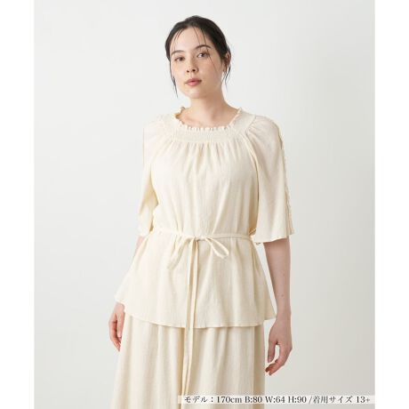 くしゅっとしたシワ感のあるナチュラルな生地に、繊細なディテールを詰め込んだフェミニンなフレアブラウス。襟ぐりに施されたシャーリングゴムが、ふんわりと柔らかなシルエットを演出します。肩にあしらったレースがさりげなく上品なアクセントに。洗いざらしのような風合いの生地は、シワを気にせず着用できるのが魅力。軽やかな風合いでこれからのスイッチシーズンにぴったりです。同素材のボトムスと合わせれば、ワンピースのようなセットアップスタイルも可能。
