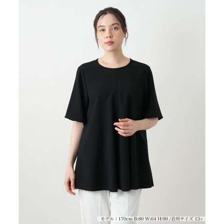 美しく揺れる豊かなフレアシルエットが主役のブラウス。身にまとうだけで計算されたようなドレープが生まれ、気になる身体のラインを拾わずにエレガントな佇まいを演出します。シンプルなクルーネックとゆったりとした袖のデザインが、美しいシルエットを一層引き立てます。しなやかな伸縮性のある素材を使用しているため、着心地はストレスフリー。やや薄手の生地感は、初秋の季節にぴったりです。ご自宅で手洗いできるイージーケアも嬉しいポイント。バックネックはループボタンにより開閉が可能。