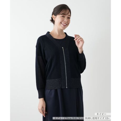 スポーティーなジップアップデザインに、前立ての煌めくラメが上品な華やかさを添えるジップアップカーディガン。シャープな印象のVネックが、顔周りをすっきりと演出。縦のラインを強調するようなシルエットでスタイルアップ見せ効果も叶えます。やや薄手のニット素材は軽やかでストレスフリーな着心地。繊細な透け感が、重くなりがちなこれからの季節の着こなしに抜け感をプラスします。気軽に羽織えるライトアウターとしても最適です。