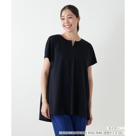 フロントはすっきり上品なキーネックのブラウスですが、背中に異素材のプリーツがのぞくバックコンシャスな一枚。背中のスリットからふわりと揺れるプリーツが、360度どこから見ても美しいシルエットを演出。アクセントになったリングベルトがスタイルを引き締めます。気になるヒップラインをカバーしてくれる、チュニック丈も嬉しいポイント。やや薄手の素材感なので残暑が残る季節も活躍してくれます。細身のパンツを合わせるだけで、洗練された大人のカジュアルスタイルが完成。