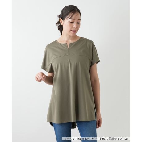 フロントはすっきり上品なキーネックのブラウスですが、背中に異素材のプリーツがのぞくバックコンシャスな一枚。背中のスリットからふわりと揺れるプリーツが、360度どこから見ても美しいシルエットを演出。アクセントになったリングベルトがスタイルを引き締めます。気になるヒップラインをカバーしてくれる、チュニック丈も嬉しいポイント。やや薄手の素材感なので残暑が残る季節も活躍してくれます。細身のパンツを合わせるだけで、洗練された大人のカジュアルスタイルが完成。
