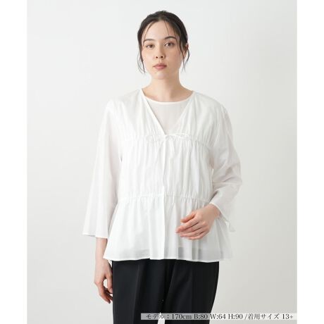 ふわりと風をまとうような、軽やかなシルエットが魅力のVネックブラウス。胸元のリボンと2段のティアード切り替えが、上品な甘さと華やかさを演出。高めの位置でウエストをシェイプしたデザインが、腰位置を高く見せ、自然なスタイルアップを実現。気になるお腹周りはティアードがふんわりとカバーしてくれます。デコルテをきれいに見せるVネックと、手首がのぞく七分袖が、女性らしい抜け感をプラス。やや薄手で繊細な透け感のある生地感で残暑の厳しいシーズンにも最適です。ご自宅で手洗いできる手軽さも嬉しいポイント。