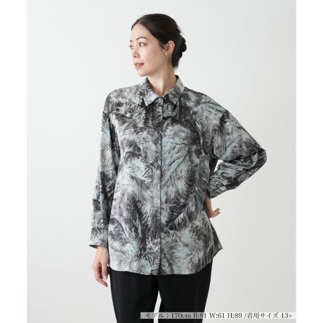 大胆なフェザープリントが、着こなしをドラマティックに彩る比翼仕立てのシャツブラウス。しなやかな風合いの生地が美しいドレープを生み出し、エレガントな雰囲気を演出します。程よくゆとりのあるリラックスシルエットで着心地も快適。ボタンを留めて一枚で着るのはもちろん、Tシャツの上にラフに羽織るスタイルもおすすめ。同素材のスカートと合わせれば、ワンピース見えする格調高いセットアップスタイルが完成します。