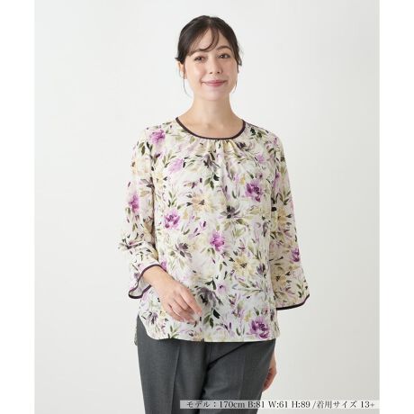 優美な花柄が際立つ、エレガントなブラウスです。繊細なプリントが大人の女性の品格を引き出し、華やかな印象を与えます。顔周りをすっきりと見せる上品な丸首デザインで、アクセサリーをプラスしても美しくまとまります。七分袖は、季節の変わり目や、ジャケットやカーディガンを羽織る際にもすっきりと着用可能です。お出かけからちょっとしたお集まりまで、幅広いシーンで活躍する一枚です。ご自宅で手洗いができるウォッシャブル仕様で、お手入れが簡単なのも魅力です。