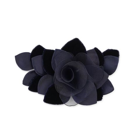 セレモニーの装いを、より一層華やかに引き立てるエレガントなコサージュ。ベルベットのような光沢のある花びらと、透け感のあるオーガンジーの花びらを丁寧に重ね、立体感豊かに仕上げました。深みのあるシックなカラーが、大人の女性らしい上品さと落ち着きを演出。ジャケットやワンピースの胸元に添えるだけで、コーディネートがぐっと格調高い印象になります。大切な一日を美しく彩る、とっておきのアイテムです。