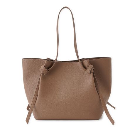 サイドの結び目がシンプルな中にこなれたアクセントを添える、ユニークなデザインのトートバッグ。シボ感のある上質な合成皮革は、本革のようなリッチな表情ながら、軽量で雨の日も気兼ねなく使えるのが魅力です。毎日の荷物をしっかりキャッチ。長めのハンドルで肩掛けもスムーズです。オンオフ問わず日々のコーディネートに寄り添い、持つだけで洗練された印象を与えてくれます。