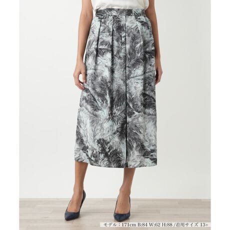 繊細なフェザーをモチーフにした、ドラマティックなプリントが目を惹くフレアスカート。ウエストのタックにより歩くたびに優雅に揺れ、華やかなAラインシルエットを描き出します。後ろウエストはゴム仕様で、リラックスした穿き心地ながら、前から見るとすっきりとした印象に。同素材のトップスと合わせれば、より洗練されたセットアップスタイルも楽しめます。秋のコーディネートの主役になる、存在感抜群のアイテムです。