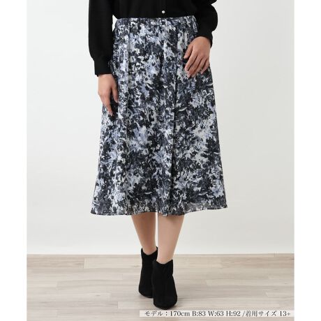 水彩画のような、抽象的なフラワープリントが目を惹くフレアスカート。歩くたびに軽やかに揺れる、量感たっぷりのシルエットが女性らしさを引き立てます。ウエストは総ゴム仕様で、ストレスフリーな穿き心地ながら、トップスをインした際もすっきりと見せてくれるのが嬉しいポイント。シンプルなニットやブラウスを合わせるだけでコーディネートが華やぐ、主役級のアイテムです。