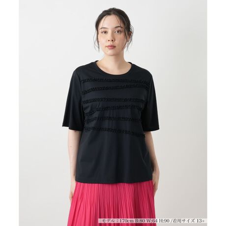 リボンボーダーで魅せる、大人の甘さが引き立つカットソー。胸元に施された繊細なリボンフリルをボーダー状に施したデザインが目を惹く一枚。シンプルなカットソーにほんのり甘いエッセンスをプラスし、さりげない個性を表現しました。コットンをベースにナイロンをブレンドした生地はさらりとした軽やかな肌触りで、これからの季節に快適な着心地を叶えます。生地には程よい伸縮性があり、動きやすさも抜群です。
