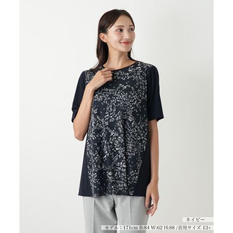 Tシャツの快適さにブラウスのような華やかさをプラスした、切り替えデザインのカットソー。フロントには様々な音符がリズミカルに踊る、遊び心溢れるプリントをあしらいました。袖や後ろ身頃は伸縮性のある無地のカットソーで切り替え、楽な着心地ときちんと感を両立しています。一枚で着て主役になるのはもちろん、ジャケットのインナーとして柄を覗かせても素敵。音楽会など、秋のお出かけシーンにもぴったりのトップスです。