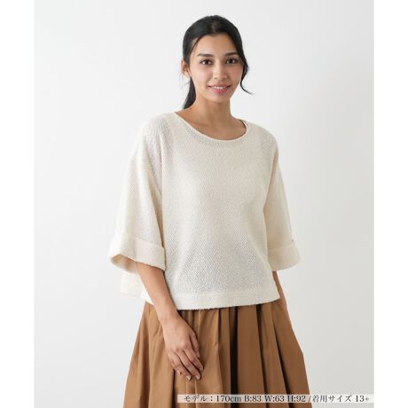 ざっくりとした凹凸感のある編地の風合いと、程よくゆとりのあるシルエットが目を惹くプルオーバー。コットン、ポリエステル、ナイロンをブレンドした、軽くふくらみのある独特の素材感が特徴。ワイドなスリーブラインと短めの着丈が、こなれたバランスを演出。袖口の折り返しデザインがさりげないアクセントに。シンプルなボトムスに合わせるだけで、存在感のある着こなしが叶うトップスです。