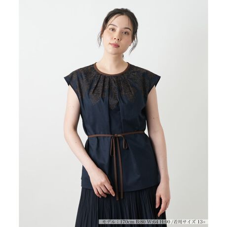 ヨーク部分に施された、繊細な花柄刺繍が顔周りを華やかに彩るブラウス。クラシカルな気品と程よい甘さを両立した主役級のトップスです。そのまま着れば気になる身体のラインを拾わない、ふんわりとしたシルエットに。付属の細リボンでウエストをきゅっとマークすれば、メリハリの効いたペプラム風の着こなしが楽しめます。肩先を上品にカバーしてくれるフレンチスリーブもポイント。きれいめのスカートやパンツと合わせれば、オフィスカジュアルから週末のお出かけまで幅広く対応します。