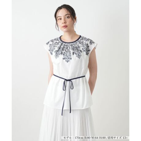 ヨーク部分に施された、繊細な花柄刺繍が顔周りを華やかに彩るブラウス。クラシカルな気品と程よい甘さを両立した主役級のトップスです。そのまま着れば気になる身体のラインを拾わない、ふんわりとしたシルエットに。付属の細リボンでウエストをきゅっとマークすれば、メリハリの効いたペプラム風の着こなしが楽しめます。肩先を上品にカバーしてくれるフレンチスリーブもポイント。きれいめのスカートやパンツと合わせれば、オフィスカジュアルから週末のお出かけまで幅広く対応します。