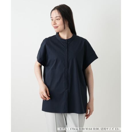 無駄を削ぎ落とした、ミニマルな美しさが際立つバンドカラーブラウス。フロントは比翼仕立てですっきりと仕上げ、クリーンで知的な印象を与えます。ゆったりとしたボックスシルエットが身体のラインを拾わず、背中のタックが作る立体感でシンプルながらも表情豊かな佇まいに。コットンの柔らかな風合いに、ポリエステルの扱いやすさをブレンドしたこだわりの生地を使用。ご自宅で手洗いできるイージーケアが魅力です。程よい伸縮性もあり、一日中快適な着心地をサポートします。