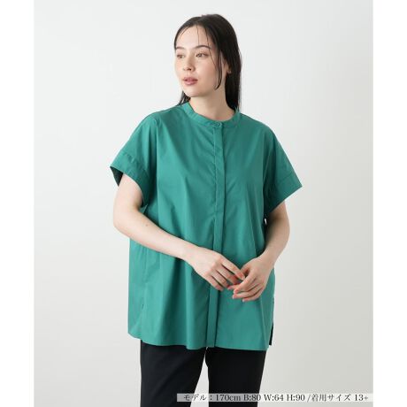 無駄を削ぎ落とした、ミニマルな美しさが際立つバンドカラーブラウス。フロントは比翼仕立てですっきりと仕上げ、クリーンで知的な印象を与えます。ゆったりとしたボックスシルエットが身体のラインを拾わず、背中のタックが作る立体感でシンプルながらも表情豊かな佇まいに。コットンの柔らかな風合いに、ポリエステルの扱いやすさをブレンドしたこだわりの生地を使用。ご自宅で手洗いできるイージーケアが魅力です。程よい伸縮性もあり、一日中快適な着心地をサポートします。