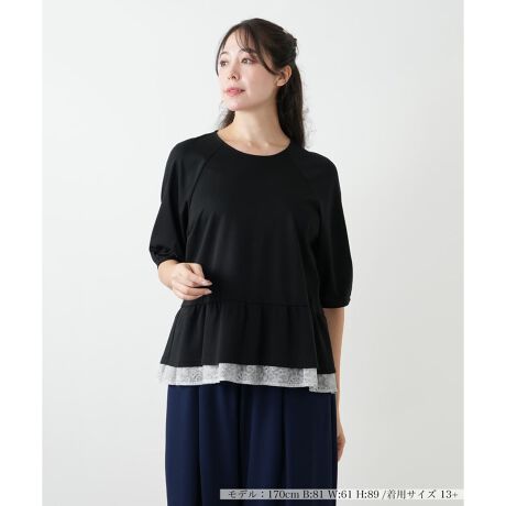 技ありのコーデを叶える、レイヤード風のペプラムカットソー。裾にはオパール加工で透け感を出したニュアンスのあるボタニカル柄のファブリックをあしらい、軽やかな表情をプラスしました。ペプラムデザインが気になるウエスト周りをナチュラルにカバーしてくれます。身頃は伸縮性のある素材を使っているので着心地も快適で、細身のパンツを合わせるだけでフェミニンなカジュアルスタイルが完成します。