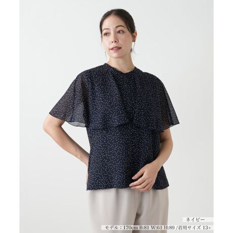 ケープを纏ったようなレイヤードデザインの襟が、顔周りをドラマティックに彩るドット柄ブラウス。動くたびに優雅に揺れるドレープがエレガントな表情を演出します。気になる肩や二の腕のラインもふんわりと優しくカバー。同素材のボトムスと合わせれば、ワンピース見えして、華やかなセットアップスタイルも楽しめます。一枚で特別な日の装いが完成する、主役級のトップスです。