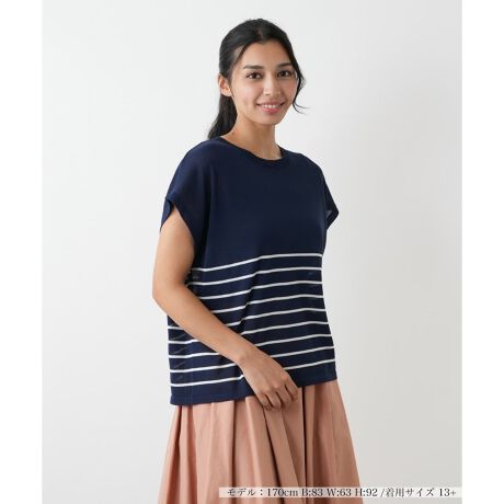 リズミカルなボーダーが、爽やかなアクセントを添えるニットベスト。肩先をカバーするフレンチスリーブ風のデザインが腕周りを華奢に見せます。シャリ感のある薄手のニットは、程よい透け感があります。まだ暑さの残る初秋の季節に心地よく、一枚でコーディネートの主役になります。スカートにもパンツにも合わせやすく、着回し力も抜群。