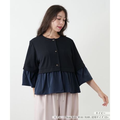 異素材コンビネーションが目を惹く、ドラマティックなノーカラージャケット。身頃上部は伸縮性のある素材で、カーディガンのように快適な着心地を実現しました。裾のペプラムと袖に切り替えたハリのある布帛が、美しいフレアシルエットをキープ。ウエストの位置を高く見せ、女性らしいメリハリのある着こなしを後押しします。ご自宅で洗えるイージーケアも魅力の一着です。