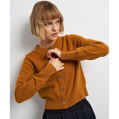 ふくらみのある柔らかい肌触りのウール糸を使用したクルーネックニットカーディガン。