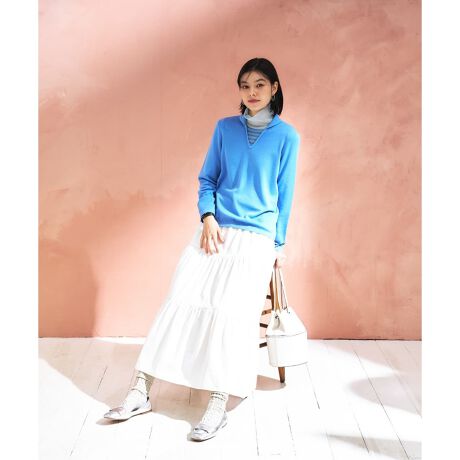 コットンに麻をブレンドした、軽やかな生地感のロングティアードスカート。柔らかな風をはらんで優雅に広がり、贅沢なボリューム感がありながら、見た目にも涼しげな一枚です。ウエストは総ゴム仕様で穿き心地も快適。アンダースカート付きなので安心して着用いただけます。落ち着いたシックな色合いでコーディネートしやすく、シンプルなTシャツと合わせるだけで、リゾート感のあるフェミニンルックが完成します。